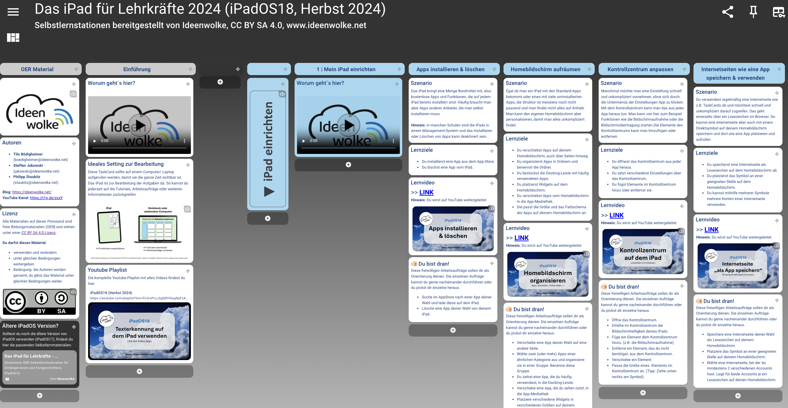 Es handelt sich um eine digitale Pinnwand (TaskCard), die Selbstlernstationen rund um das Thema iPad enthält. Die gesamte Pinnwand steht unter einer offenen Lizenz und kann im Gesamten oder in Teilen von dir verwendet, verändert und geteilt werden. Autoren: Bödigheimer, Jakowski, Staubitz Lizenz: CC BY SA 4.0 |