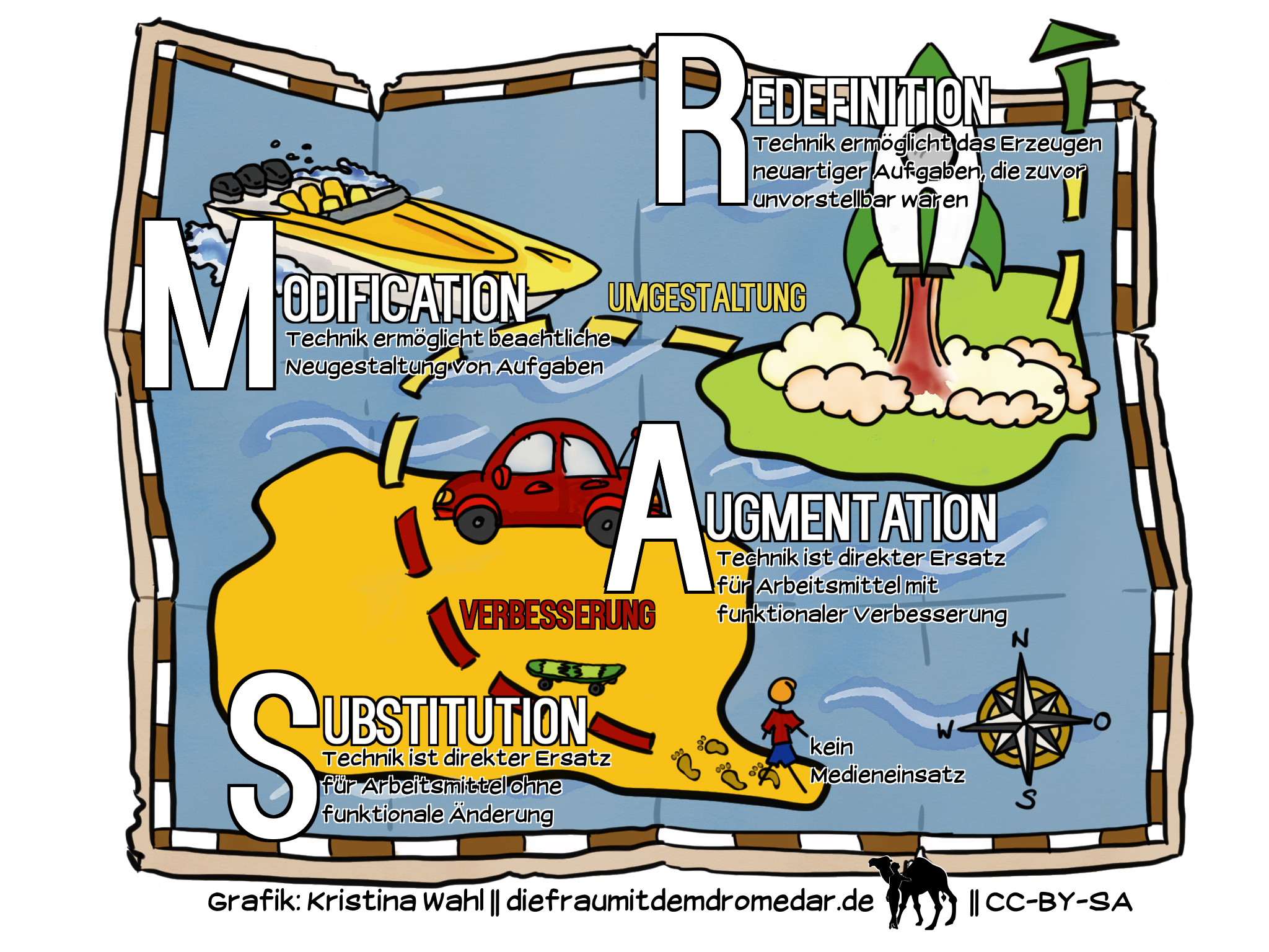 Es handelt sich eine Grafik, die das SAMR-Modell darstellt. Die Lizenz wurde von der Autorin direkt an der Grafik angebracht. Man kann diese auch in anderer Form angeben. Autoren: Kristina Wahl Lizenz: CC BY SA 4.0 |